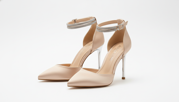 Ordinarie pris $105.00Effortlessly elegant champagne stilettos featuring shimmering multi-row crystal ankle straps and a sleek metallic silver heel. A sophisticated choice for glamorous evenings, cocktail attire, or upscale celebrations. -