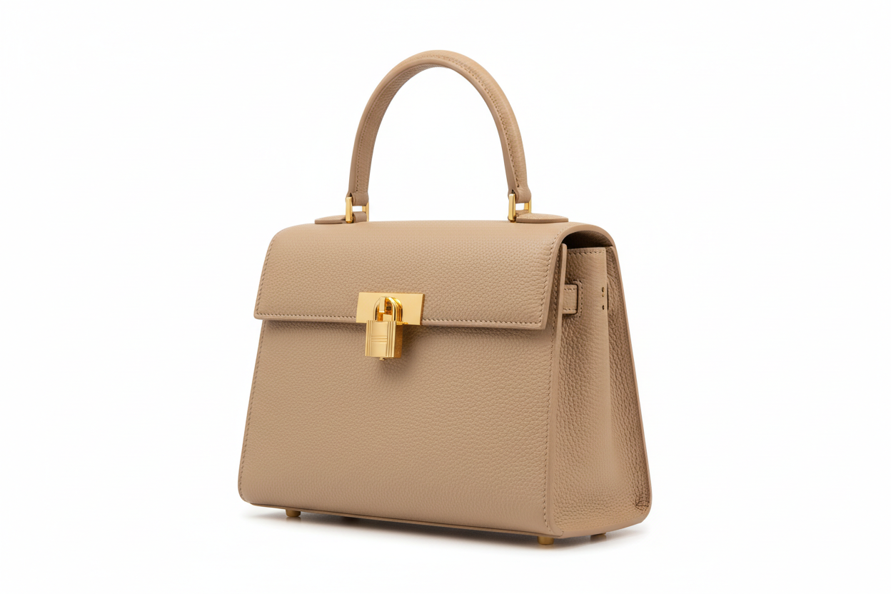 This elegant beige top-handle bag features a refined, structured silhouette crafted from textured leather. Its minimalist design is complemented by a sleek gold-tone lock closure and matching hardware, giving it a timeless, luxury appeal. Perfect for both professional and elevated everyday wear, it balances sophistication with practicality.
