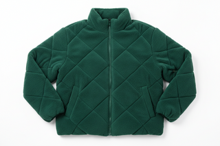 A rich forest-green puffer made from soft fleece fabric. Designed with quilted panels and a comfortable fit, offering everyday warmth with a stylish color.