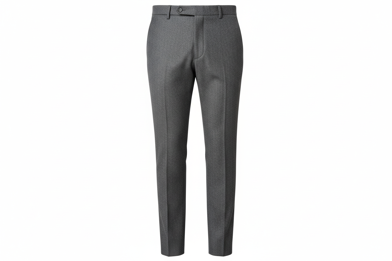 A pair of men's grey wool dress trousers on a white background. Subtle texture, tailored leg, high-quality fabric. Luxury ecommerce studio shot.