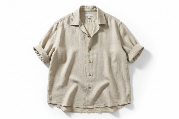 Ordinarie pris $37.50A men's beige linen shirt on a white background. Soft natural linen texture, relaxed fit, breathable fabric, slightly rolled sleeves optional. Clean studio look. -