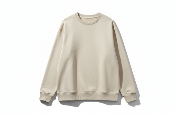 Ordinarie pris $44.99A men's cream/beige sweatshirt on a clean white background. Soft neutral tone, minimal details, ribbed cuffs, relaxed modern fit. Premium studio lighting. -