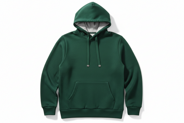 Ordinarie pris $48.99A men's dark green pullover hoodie on a white background. Clean silhouette, soft fleece interior, front kangaroo pocket, structured hood. Professional product shot. -
