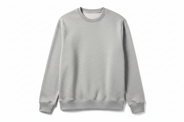 Ordinarie pris $44.99A men's heather grey crewneck sweatshirt on a white background. Soft textured heather fabric, ribbed neckline and cuffs, relaxed but tidy fit. High-end ecommerce shot. -