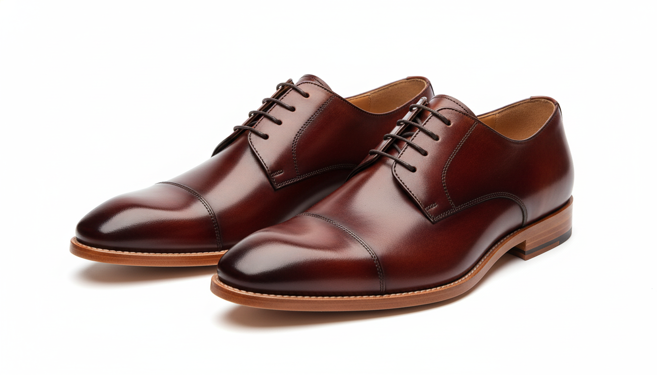 Crafted in rich burnished brown leather, these classic cap-toe Derby shoes offer timeless sophistication with modern comfort. Featuring clean stitching, a smooth rounded silhouette, and a durable stacked sole, they are perfect for business attire, weddings, and refined formalwear.