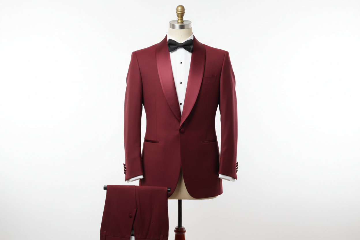 A bold deep-red tuxedo with a matching satin shawl lapel. Its rich color, smooth finish, and classic silhouette make it a powerful statement piece for elevated events.