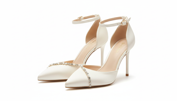 Ordinarie pris $94.50Clean, polished, and graceful—these ivory heels feature a sleek pointed toe and a sparkling diagonal crystal strap across the front. A delicate ankle strap ensures a secure fit, making them a sophisticated bridal or evening option. -