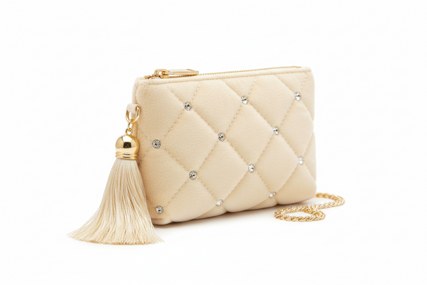 Ordinarie pris $219.00An elegant ivory clutch featuring a soft quilted exterior adorned with sparkling crystal accents. The bag includes a refined ivory tassel and gold-tone hardware, creating a sophisticated look perfect for evening events and special occasions. -