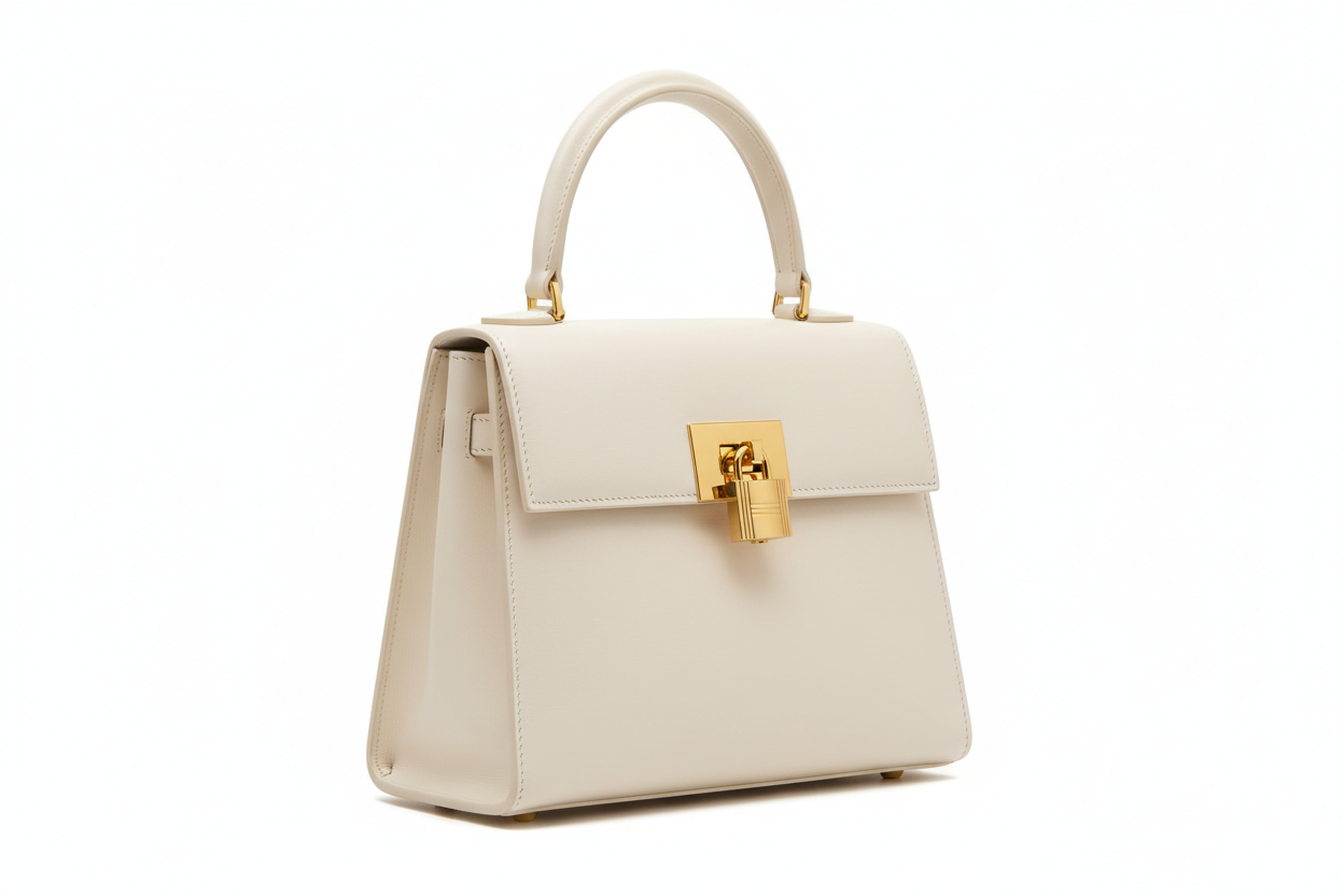 A luxurious structured handbag crafted in smooth ivory leather. The clean silhouette is complemented by a sturdy top handle and a bold gold-tone lock, creating a timeless, refined look suitable for both formal and everyday sophistication.