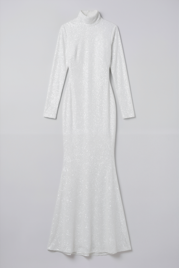 Ordinarie pris $94.50A graceful full-length gown crafted in a luminous white glitter fabric that catches the light from every angle. Featuring a fitted silhouette, long sleeves, and a refined turtleneck, this piece blends purity and glamour in equal... -