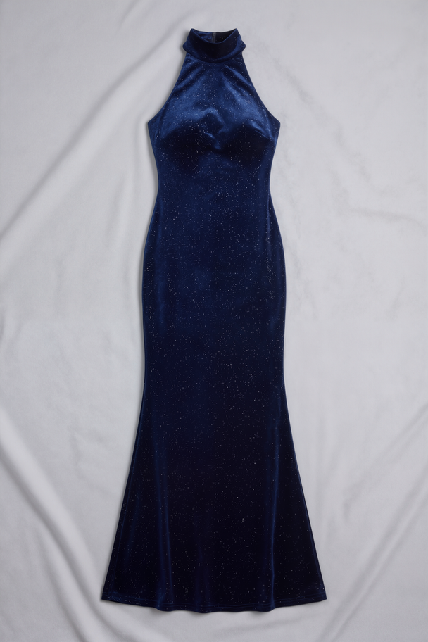 Ordinarie pris $90.00Luxurious navy velvet meets delicate glitter accents in this elegant evening gown. The sleeveless turtleneck design enhances the silhouette, offering height and sophistication. With its subtle shimmer and smooth velvet texture, this dress delivers a perfect... -