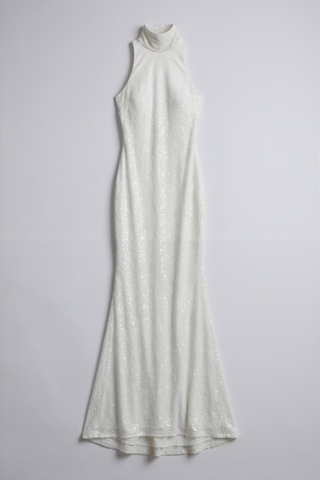A refined ivory gown adorned in fine shimmering glitter for an ethereal, luminous effect. The sleeveless turtleneck design sculpts the profile, while the long, flowing shape creates effortless elegance. Ideal for formal occasions, upscale evening events, or modern bridal moments with a glamorous twist.