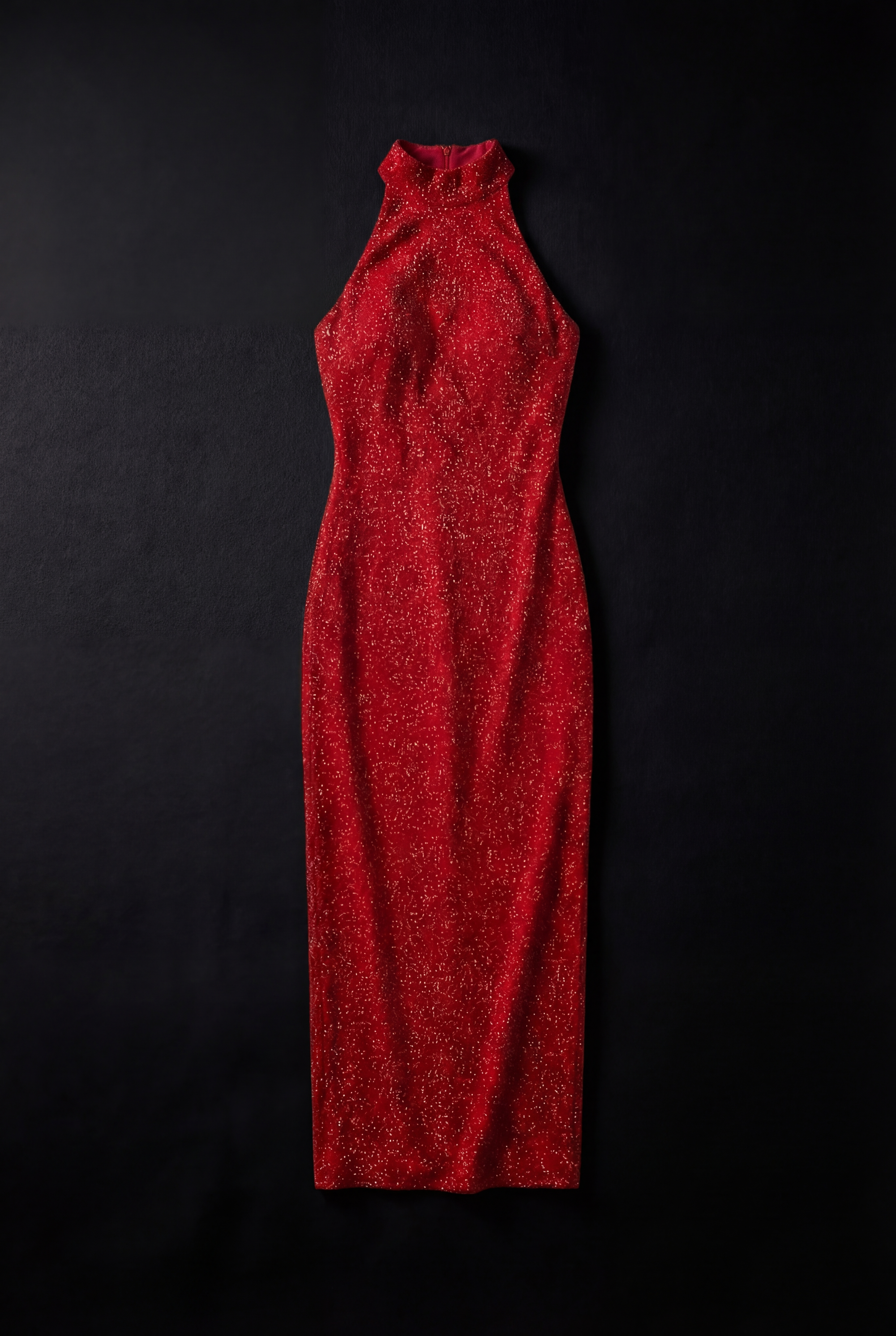 A striking, body-contouring gown designed in rich scarlet red with a soft shimmer throughout. The high turtleneck and sleeveless silhouette create a modern, sculpted elegance, while the subtle sparkle adds a glamorous evening finish. Perfect for formal events, galas, or statement moments where sophistication meets bold allure.