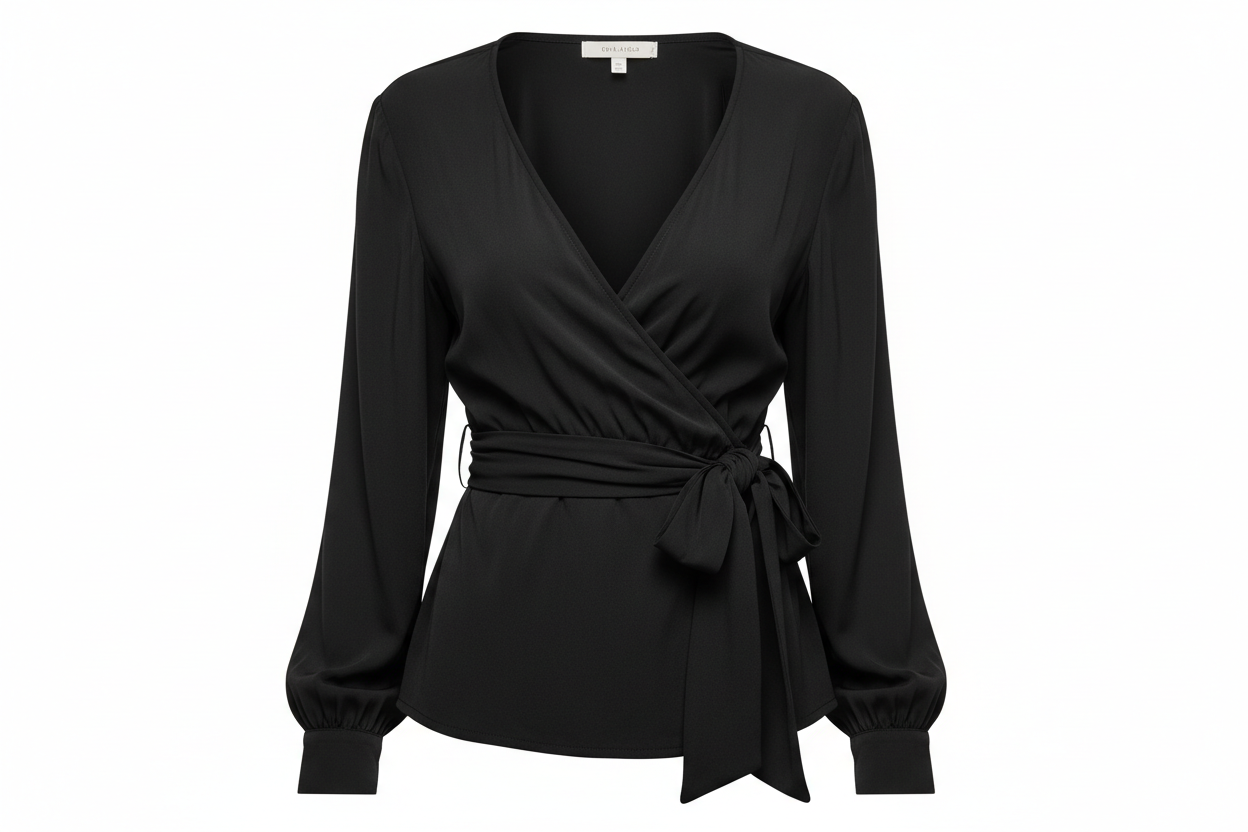 A black wrap-style blouse with a flattering V-neck and soft draped fabric.