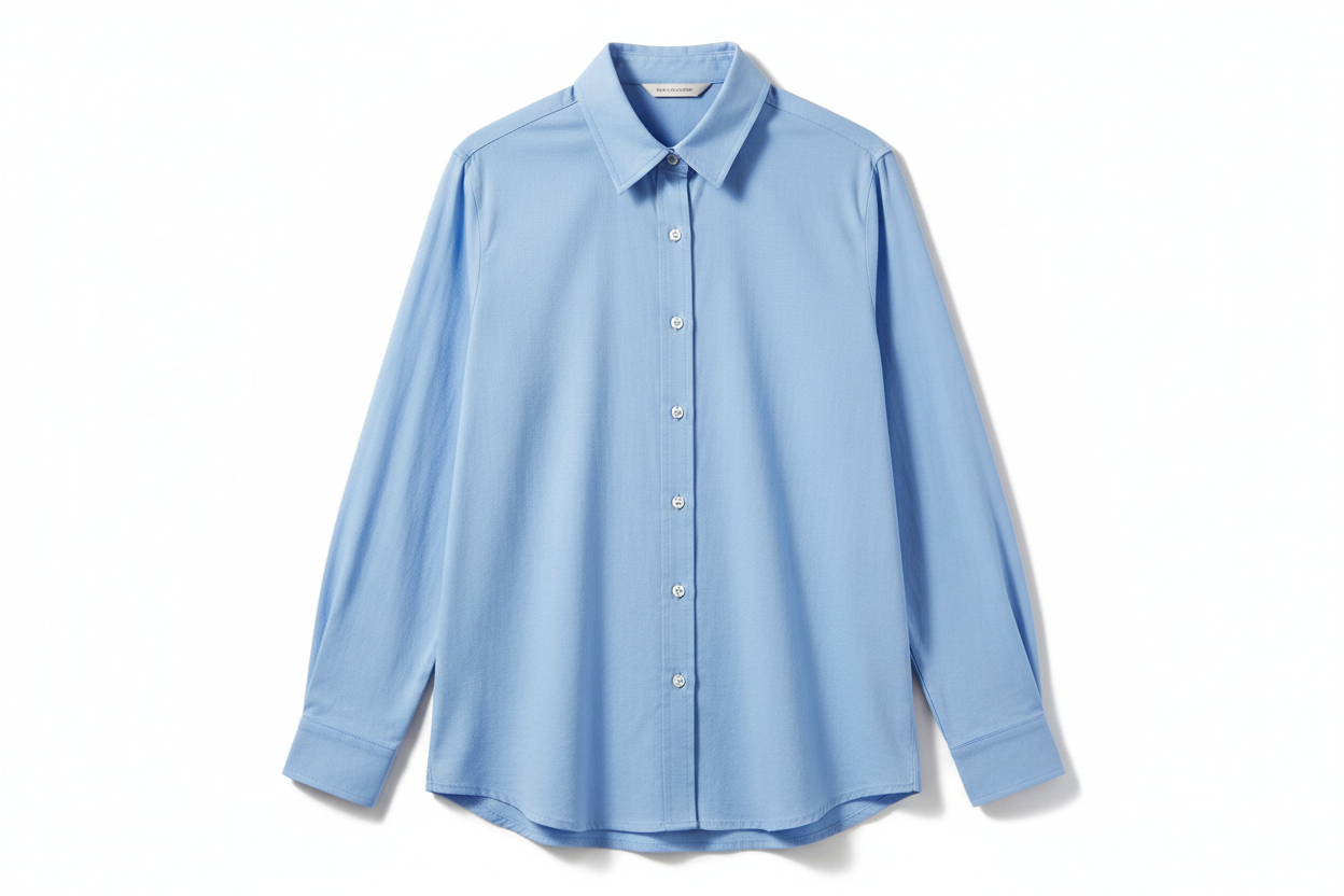 A light blue cotton shirt with structured collar, soft texture, and relaxed fit.