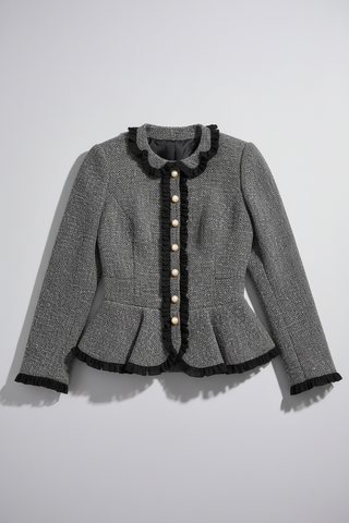 A structured peplum tweed jacket featuring elegant pearl buttons and refined black ruffle accents. Tailored to flatter with a timeless, couture-inspired finish.