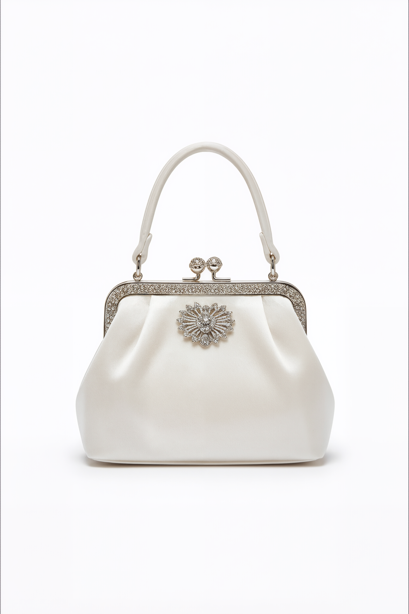 A graceful satin handbag adorned with a sparkling crystal floral brooch and a shimmering metallic frame. Its soft pleats and structured top handle create a refined silhouette—perfect for bridal or evening ensembles.