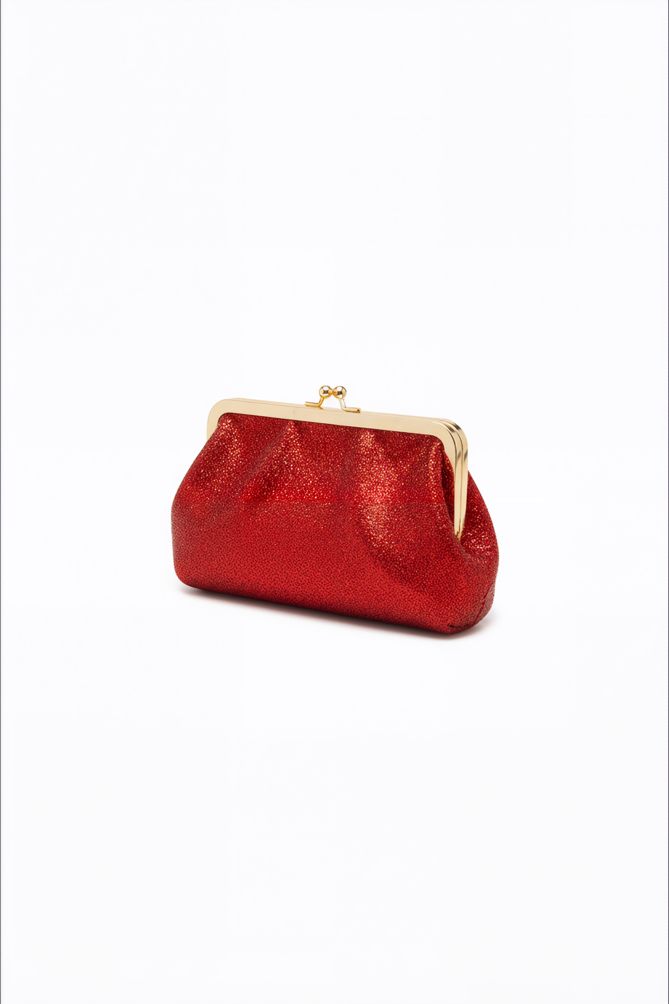 A glamorous compact clutch in shimmering ruby red satin, framed in gold with a vintage kiss-lock closure. Its softly gathered shape gives it an elegant, delicate charm—perfect for holiday parties, formal evenings, and nights out.