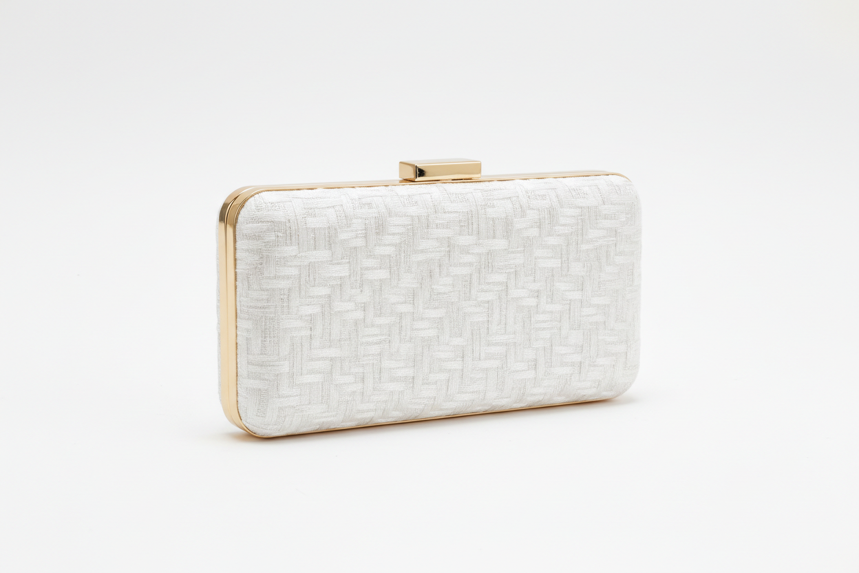 Featuring a refined, textured finish, this white clutch pairs classic elegance with a shimmer-like effect. The gold framing adds a luxurious contrast, making it ideal for weddings, galas, and upscale occasions.