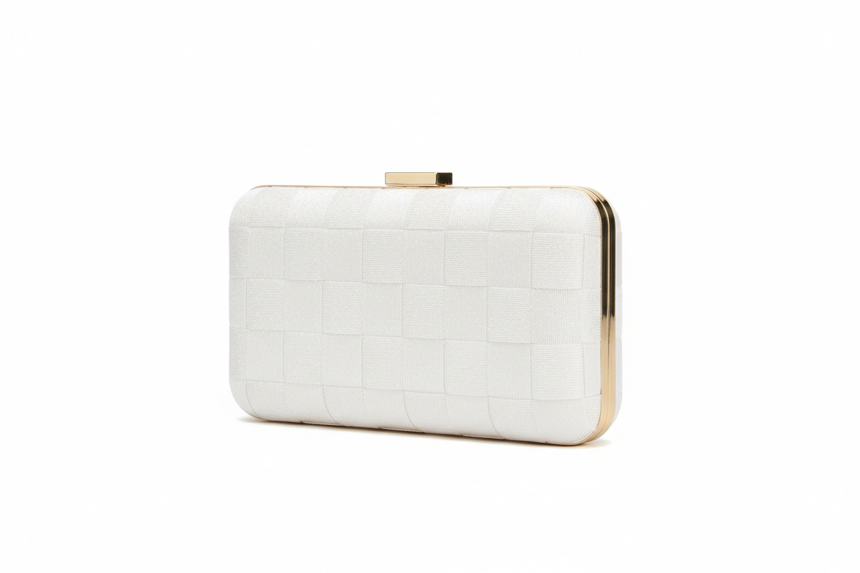 Featuring a refined, textured finish, this white clutch pairs classic elegance with a shimmer-like effect. The gold framing adds a luxurious contrast, making it ideal for weddings, galas, and upscale occasions.