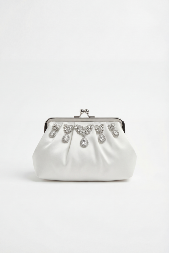This elegant white satin clutch showcases luminous pleating and exquisite crystal embellishments arranged in a cascading motif. Finished with a classic kiss-lock closure, it’s a show-stopping accessory for weddings, galas, and evening occasions.Ordinarie pris $219.00 -