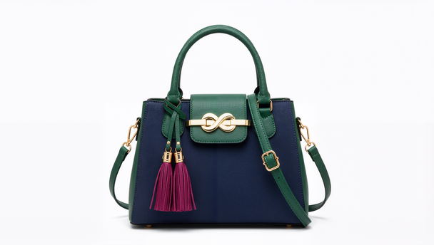 Ordinarie pris $99.00A bold, fashion-forward tote blending navy and emerald green for a striking color-block effect. Adorned with a gold infinity-style clasp and dual magenta tassels for a playful finish. Includes a detachable shoulder strap for versatile carry.... -