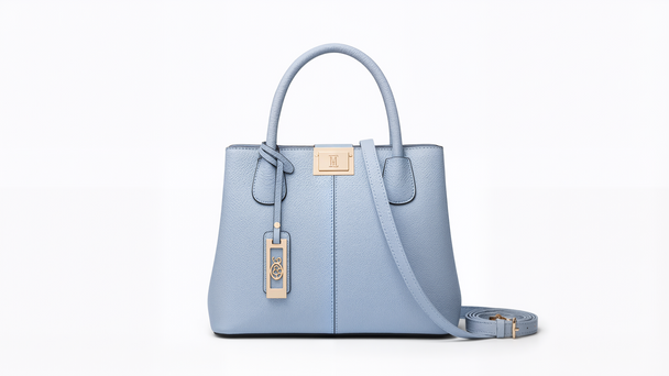 Ordinarie pris $129.00Crafted from pebbled leather in a serene powder-blue tone, this satchel features gold accents and dual top handles for timeless sophistication. Complete with a detachable shoulder strap, it's ideal for everyday elegance with a soft pop... -