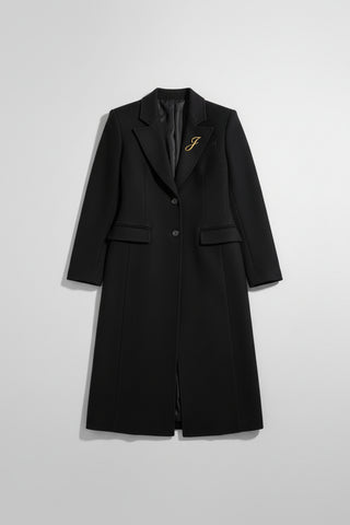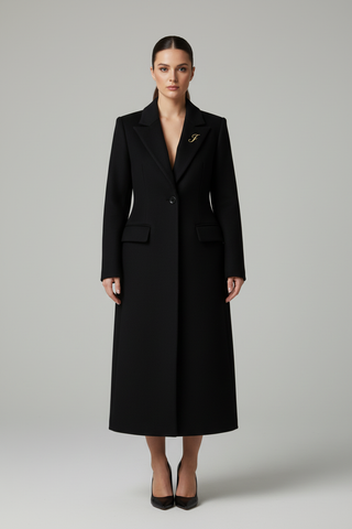A modern classic—this tailored black coat features clean lines, a flattering long silhouette, and a structured double-breasted design for elevated everyday style.