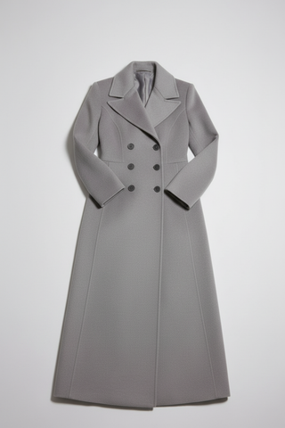 A modern classic—this tailored grey coat features clean lines, a flattering long silhouette, and a structured double-breasted design for elevated everyday style.