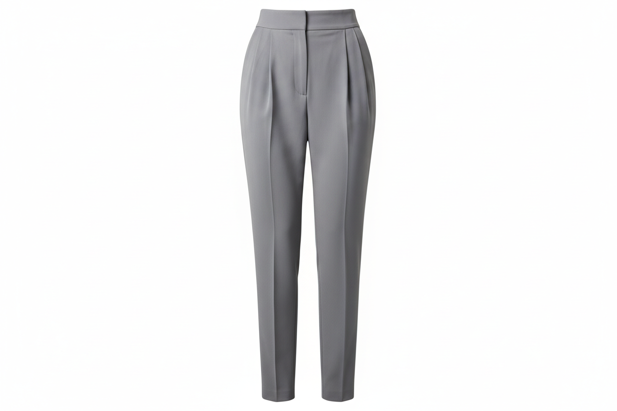 Grey high-waisted trousers with soft pleats, refined tailoring, and a structured leg.