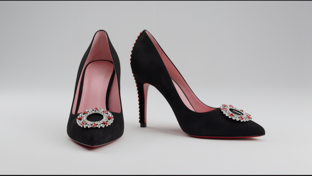 Ordinarie pris $499.00Black suede pointed-toe pumps adorned with an ornate brooch featuring red gemstones and clear crystals. The soft pink interior lining adds a feminine contrast, making these heels both elegant and eye-catching. -
