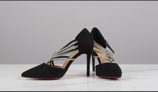 Ordinarie pris $669.00Sleek black pumps with multiple shimmering rhinestone straps that create a sculptural, multi-layered effect. The design adds drama and shine, perfect for high-fashion evenings. -