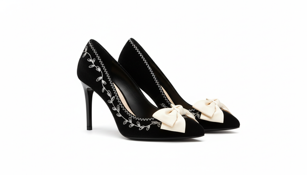 Ordinarie pris $879.99Classic black velvet pumps featuring delicate silver embroidered vine detailing along the collar. Finished with a soft ivory satin bow on the toe, these heels blend vintage charm with refined sophistication—perfect for evening events or formal... -