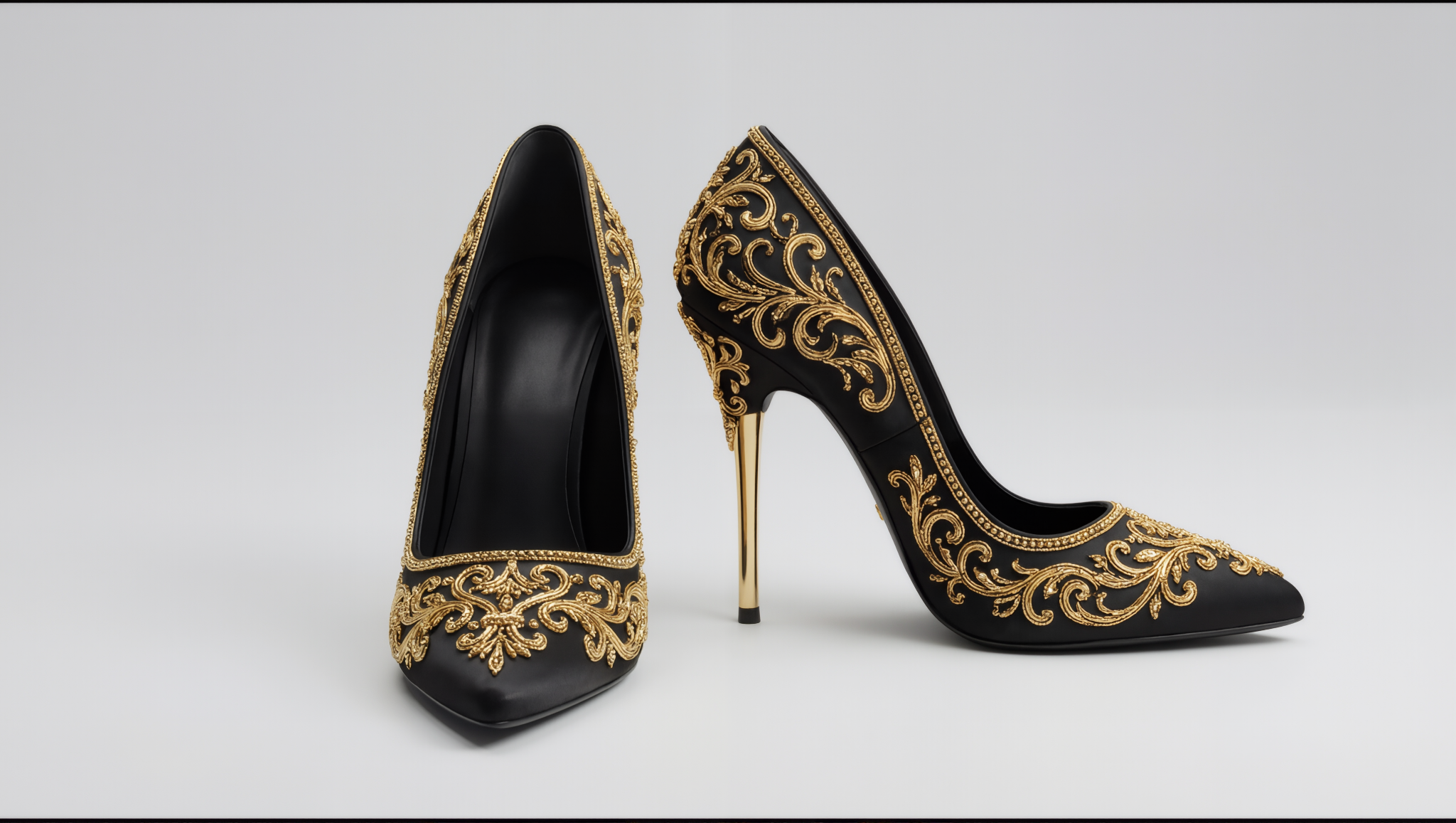 Exquisitely detailed black stilettos covered in intricate gold baroque embroidery. The metallic heel and luxurious ornamentation create a dramatic, couture-level statement ideal for opulent occasions.