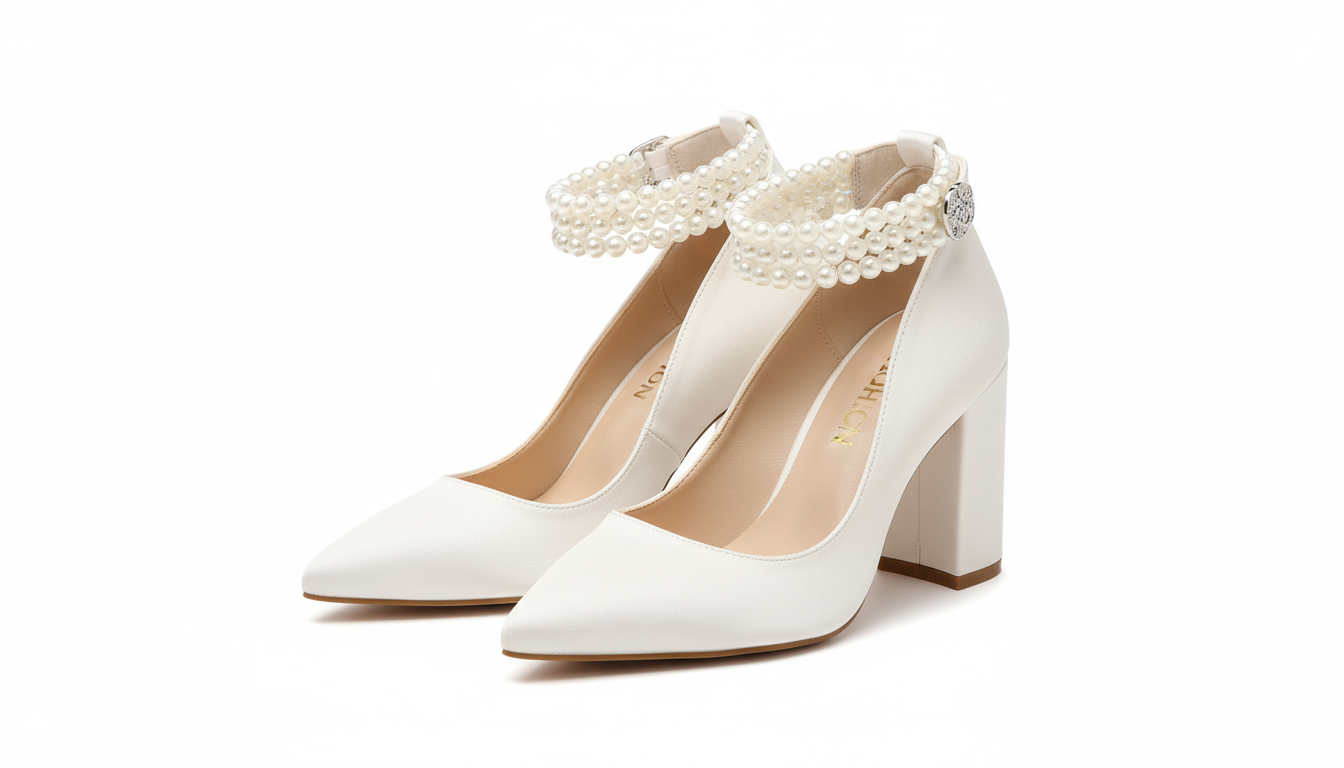Sophisticated ivory pumps featuring a bold block heel and a luxurious three-row pearl anklet adorned with a jeweled clasp. Timeless, graceful, and effortlessly bridal, these heels add classic charm to any special occasion.