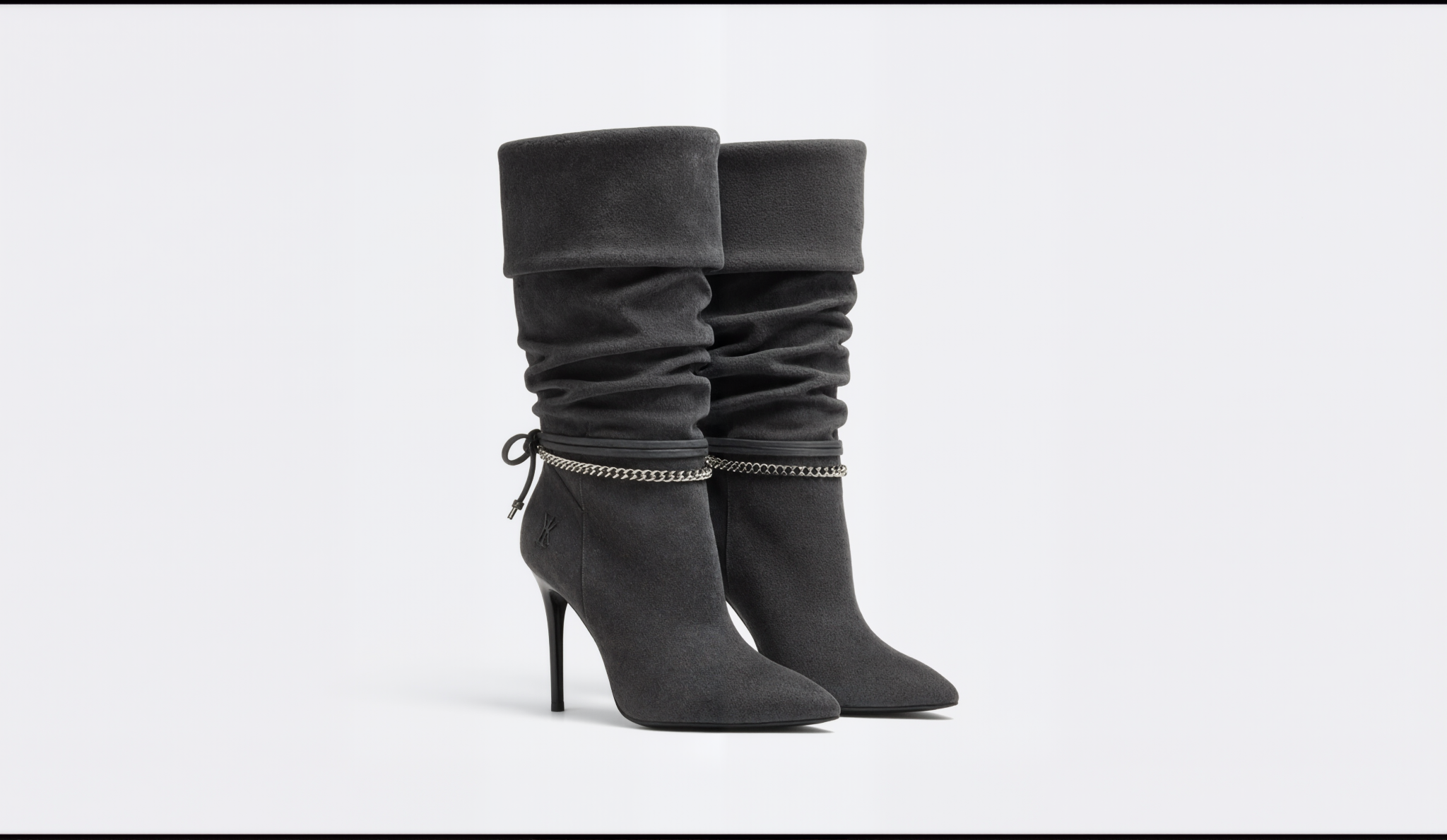 Chic black suede boots featuring a slouchy ruched shaft and fold-over cuff. A silver chain accent encircles the ankle for an edgy, high-fashion touch. Perfect for elevating both fall and winter looks.
