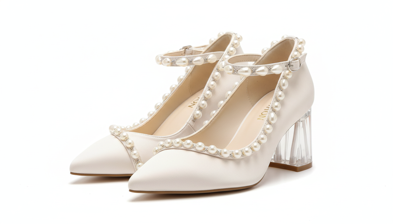 A striking combination of modern and classic, these ivory pumps feature pearl-lined T-straps and a transparent block heel. The unique design delivers both contemporary edge and romantic sophistication—perfect for bold brides.