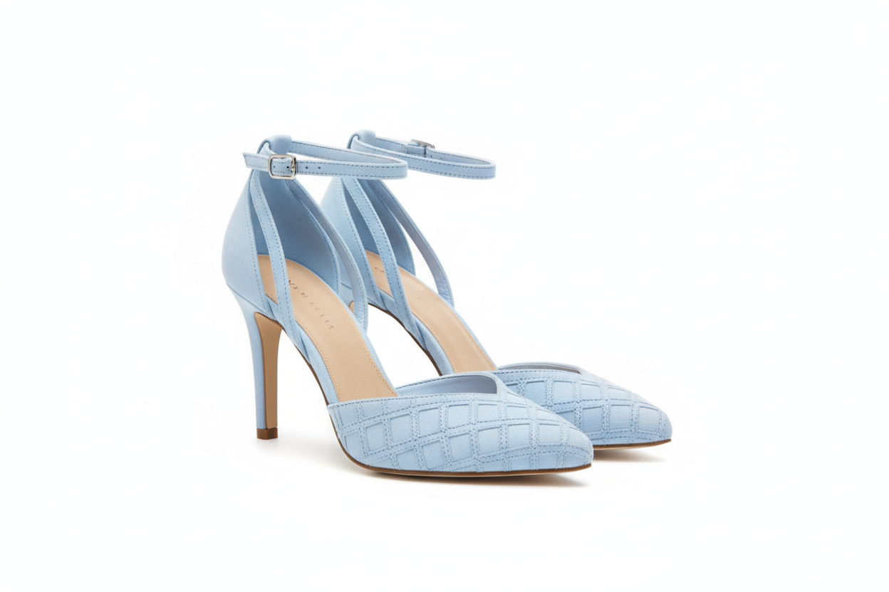 Delicate powder-blue pumps featuring a quilt-patterned pointed toe and elegant criss-cross ankle straps. Soft, feminine, and gracefully structured—ideal for spring events or refined daytime styling.