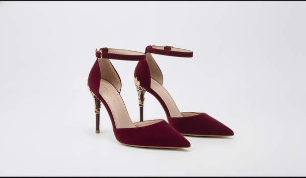 Ordinarie pris $955.00Deep burgundy suede heels with a pointed toe and sleek ankle strap, enhanced by gold ornamental detailing at the heel base. A luxurious and feminine silhouette ideal for upscale dinners or romantic nights out. -