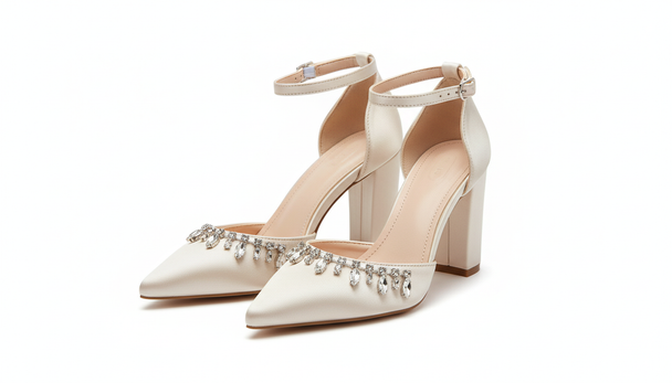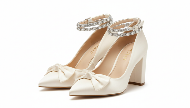 Ordinarie pris $100.00Soft ivory block-heel pumps adorned with a delicate front bow and shimmering double-row crystal anklet straps. Designed for comfort and elegance, these shoes offer a perfect blend of sparkle and sophistication for brides and special occasions. -