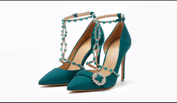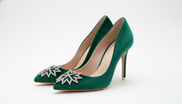 Ordinarie pris $1,099.00Striking emerald green pumps enhanced by glittering crystal leaf embellishments at the toe. A rich, jewel-toned statement piece that elevates any outfit with elegance and sparkle. -